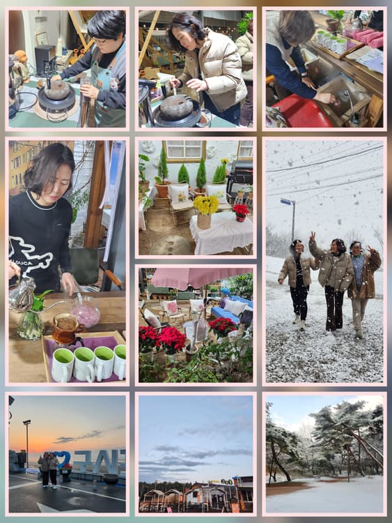 첫번째 이야기. 아기자기 예쁜 인테리어와 커피체험.족욕체험.식사 에 홀려 선택한 여행. 사실 먹여주고 재워준대서 선택했지만 궁극적으로 무엇을 하는지 정확한 이해없이 일정을 시작했다. 언니들과 수다삼매경에 입구마저 쉼드림 입구마저 지나쳐 길을돌아 도착한 쉼드림. 친절함 장착하신 호스트님의 반김으로 힐링캠프는 시작되었고 맷돌드립커피와 함께 시작한 족욕은 우리의 이야기꽃과 하염없이 길어만 갔다. 고창의 명소를 여행하며 추억을 남기는것이 모티브인 쉼드림의 취지를 호스트님께 전해 듣고 숙소에만 짱박혀 있으면 안되겠다 싶어 나선 앞마당에선 함박눈이 펑펑내리고 있어 첫눈을 만끽하는 기쁨을 주었고, 하얗게 옷을 입어가는 시골의 고즈넉함과 함께 고창읍성에선 입장료3천원을 지역상품권으로 돌려받아 특산물매장을 구경하는 즐거움과 조금늦게 아차싶어 일몰을 보기위해 달려간 구시포해수욕장, 아직 해가지지 않았음에도 뒷편 하늘에 동그랗게 모습을 드러낸 어스름달이 함께하는 모습도 오랫만에 보았다^^ 6시 식사가 되기전에 숙소로 귀환해야했기에 바지런히 돌아온 쉼드림엔 러시아에서 온 외국인팀이 저마다 한국의 정서를 사진에 남기며 즐기고 있었고 정갈하고 예쁘게 차려진 상차림이 복분자와인과 함께 제공되었다 음식하나하나에 정성과 맛이 가득했고 만족스럽게 식사를 끝내고 올라간 숙소는 2탄에서~